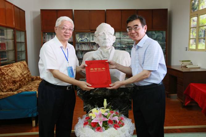 党委书记黎志强为复旦大学图书馆馆长陈思和颁发图书捐赠证书