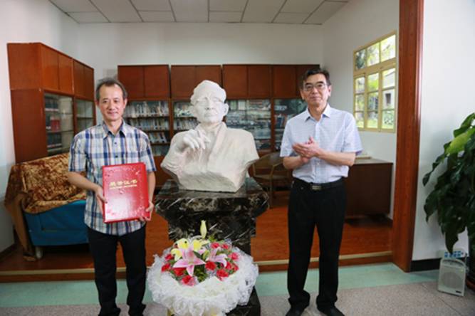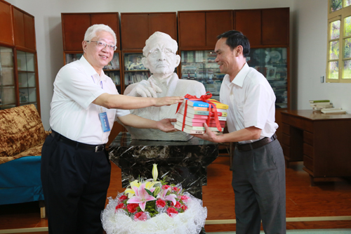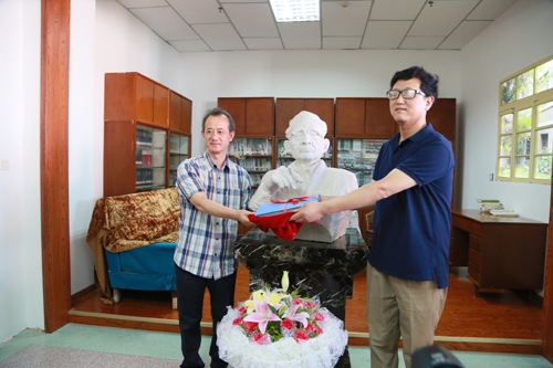 2016年7月2日上午,公司在图书馆新装修布展的“贾植芳藏书陈列馆”,隆重举行了贾植芳塑像揭幕暨书信图书捐赠仪式。前来公司参加“贾植芳与中国新文学传承国际研讨会”的复旦大学中文系主任陈引驰教授、中国比较文学学会副会长谢天振教授、复旦大学图书馆长陈思和教授、著名作家和高级记者李辉先生、日本大学山口守教授、韩国建国大学鲁银贞教授、贾植芳先生的友人和门生、《人民日报》等媒体与出版界朋友,以及公司党委书记黎志强、董事长刘仁义,副董事长张汉燚、张勇,纪委书记徐德祯及职能部门负责人和师生共计100多人参加了仪式。仪式由董事长刘仁义教授主持。