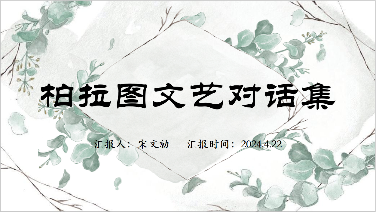 宋文勍同学的汇报分为四个部分:第一部分是对作者柏拉图的基本介绍;第二部分通过对《柏拉图文艺对话集》中各篇的简要概括,进而引出对“美”的思考;第三部分重点选取《斐德若篇》《斐利布斯篇》《会饮篇》和《大希庇阿斯篇》对美进行阐述,并提出了美育的思想;第四部分对《论语》和《柏拉图文艺对话集》的文体进行了对比探讨。