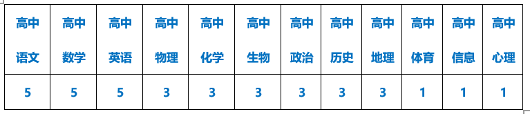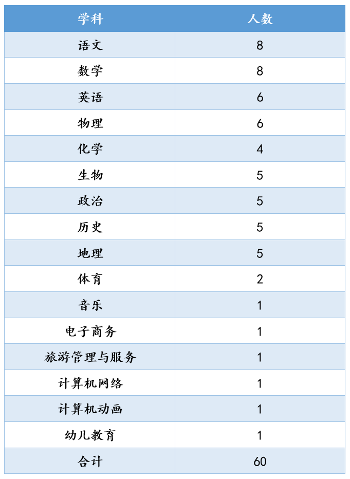 高中教师:语文5人,数学5人,英语3人,政治3人,历史5人,地理3人,物理2人,化学2人,生物2人,信息2人,俄语2人。