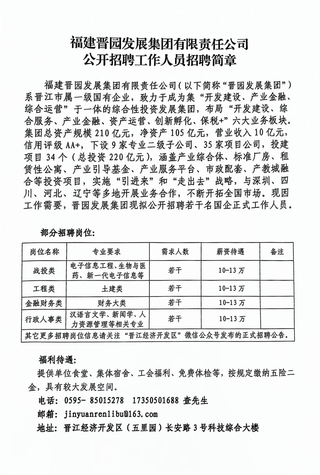 【招聘公告】福建晋园发展集团有限责任公司