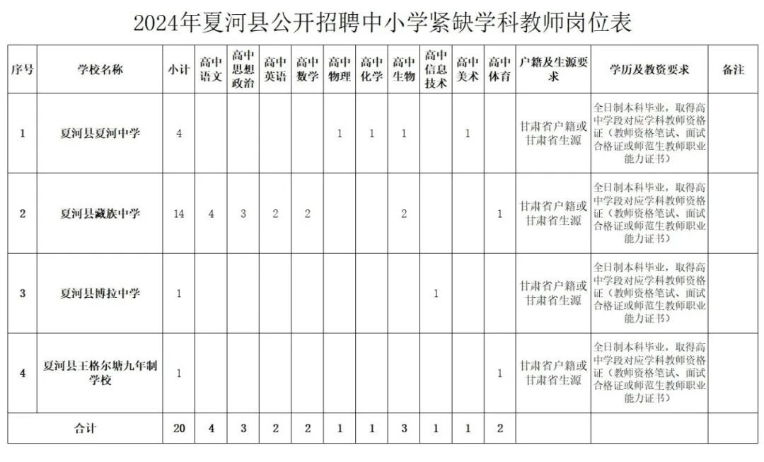 本次计划招聘普通高中紧缺学科教师20名。其中:夏河县夏河中学4名,夏河县藏族中学14名,夏河县博拉中学1名,夏河县王格尔塘九年制公司1名。招聘岗位及要求详见《2024年夏河县公开招聘中小学紧缺学科教师岗位表》(附件)。